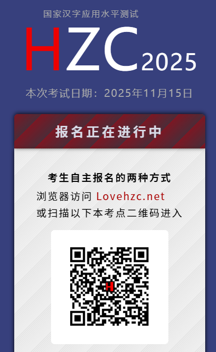 各二级学院、终身教育学院和有关职能部门: 根据《教育部语用司关于推进汉字应用水平测试工作的通知》(教语用司函﹝2016﹞28号)要求,以及上海市语委2025年语言文字工作要点,上海市教师教育学院下发了“关于开展2025年上海市汉字应用水平测试报名工作的通知”。为做好有报考意愿师生的报名和测试工作,现将有关具体事项通知如下: 一、汉字应用水平测试简介 汉字应用水平测试(HZC)是教育部、国家语委组织实施的语言类标准化水平测试。适用于公务员、编辑、记者、校对和文字录入人员,各级各类学校教师和学生,文秘及办公室工作人员,广告业从业人员,中文字幕机操作人员,高等学校和中等学校以及日常工作与汉字应用紧密相关的人员;同时也适用于想要了解自己汉字应用水平和能力的其他人员。 二、测试时间、地点 时间:2025年11月15日(星期六)9:00—10:20 地点:上海工商外国语职业学院 三、报名对象 2023级、2024级在籍在校学生、在职教职工。 四、报名时间 即日起至10月10日截止。 五、报名缴费方式和要求 1.线上报名和缴费 请参加测试的师生微信扫码报名,点击“大学生在线报名”或“其他教师在线报名”按钮,填写个人信息并上传照片,核对信息无误后提交并完成线上缴费。 2.上传报名照片格式要求(用于准考证和证书打印) (1)相片格式:.jpg .jpeg .png 格式; (2)相片大小不超过2.5Mb; (3)相片比例建议为 390*520 像素(宽*高); (4)相片背景色为单色背景,如蓝色、白色或红色等。 六、测试费和考前培训安排 1.测试费:60 元/人,报名缴费后,若考生不能按时参加考试,测试费一律不退。 2.考前辅导培训和测试模拟资料 11月上旬安排考生参加测试前辅导培训,具体时间另行通知。测试资料微信关注“探索汉字”小程序,登录后进行模拟练习和测试。 七、测试内容 1.测试题型 第一部分:字音选择判断,共30题。 第二部分:字形选择判断,共30题。 第三部分:综合选字填空,共30题。 第四部分:汉字书写填空,共30题。 2.测试分值和等级 汉字应用水平测试分数的满分值为800分。 一级水平:《汉字应用水平测试字表》(甲表)作答正确率80%(含)以上,且HZC分数600分(含)以上。 二级水平:《汉字应用水平测试字表》(甲表)作答正确率65%(含)以上,且HZC分数500分(含)至600分(含)之间。 三级水平:《汉字应用水平测试字表》(甲表)作答正确率50%(含)以上,且HZC分数200分(含)至500分(含)之间。 不入级:《汉字应用水平测试字表》(甲表)作答正确率50%以下,且HZC分数200分以下。 八、报名测试咨询 联系人:杨老师 办公室:工商外中区5号楼二楼50213 电 话:68025965 九、证书发放 测试入级者可获得国家语言文字工作委员会颁发的《汉字应用水平测试等级证书》。证书一般在第二年4月下发。 上海工商外国语职业学院 上海思博职业技术学院 语言文字工作委员会 2025年9月18日 |