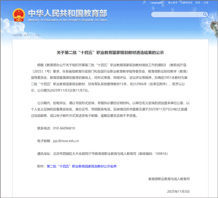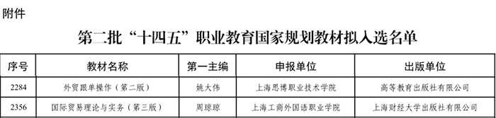 11月3日,教育部发布《关于第二批“十四五”职业教育国家规划教材遴选结果的公示》,由我校副校长、商学院教授姚大伟主编的《外贸跟单操作(第二版)》教材,以及由周琼琼副教授主编的《国际贸易理论与实务(第三版)》教材成功入选。