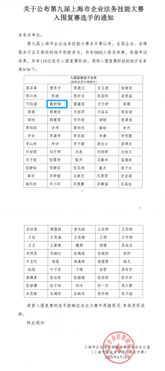 近日,在上海市第九届法务技能大赛初赛中,我校法律2304班戴舒娴同学凭借扎实的法律专业功底、出色的实务分析能力及临场应变表现,在激烈的竞争中脱颖而出,成功晋级复赛!