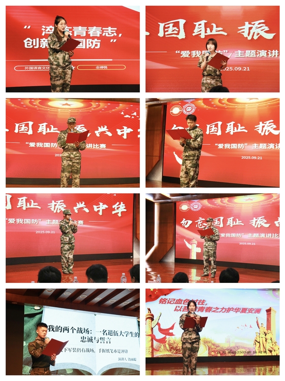 时值中国人民抗日战争暨世界反法西斯战争胜利80周年,为深入学习贯彻习近平强军思想和习近平文化思想,扎实推进《中华人民共和国国防教育法》实施,进一步增强广大学生国防意识和刻苦学习、报效祖国的爱国情怀,9月21日,我校于四号楼四楼报告厅举办以“勿忘国耻,振兴中华”为主题的“爱我国防”演讲比赛决赛。